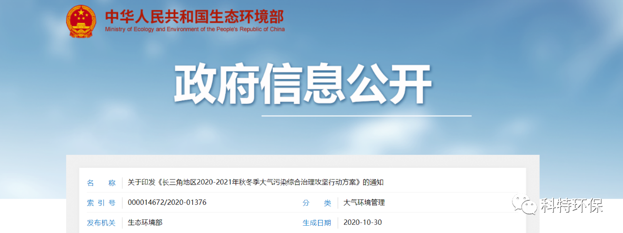 生態環境部、國家發展和改革委員會、工業和信息化部等10部門與上海、江蘇、浙江、安徽等4省(市)人民政府聯合印發《長三角地區2020-2021年秋冬季大氣污染綜合治理攻堅行動方案》(以下簡稱《行動方案》)